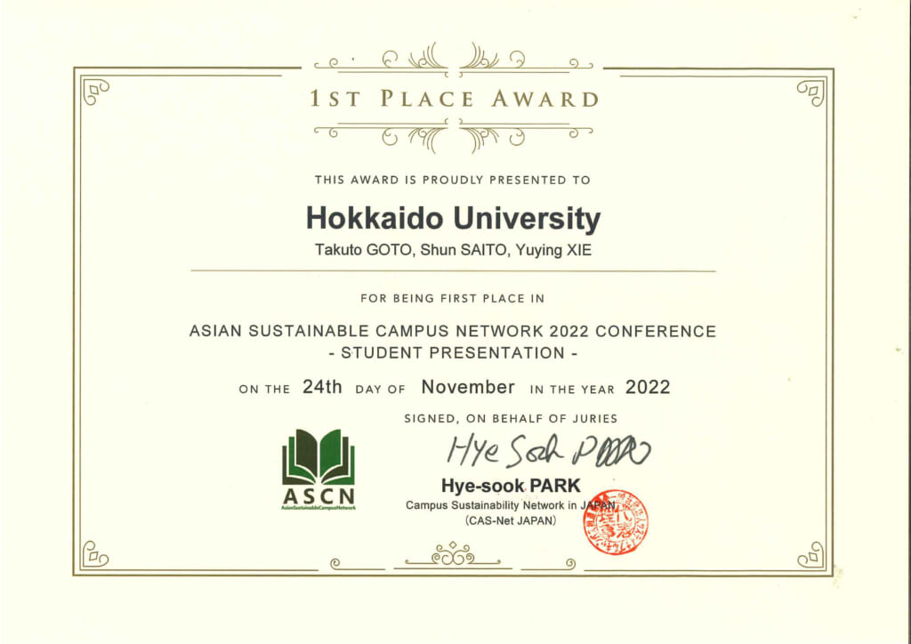 大学院工学研究院とサステイナブルキャンパスマネジメント本部で実施している教育プログラム「計画・設計特別演習Ⅰ」における学生の成果発表が、アジア・サステイナブルキャンパスネットワーク(Asia Sustainable Campus Network 、ASCN)2022年次大会で「1st PLACE AWARD」を受賞しました。