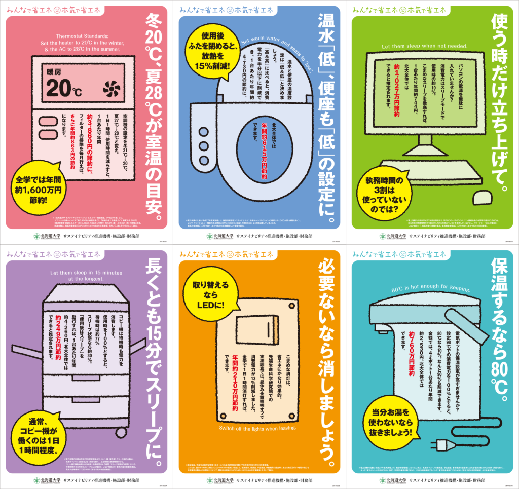 本学では、環境負荷の低いキャンパスを目指し、サステイナブルキャンパスアクションプラン2016に基づき、省エネルギーを推進するためのステッカー・ポスターを作成しています。