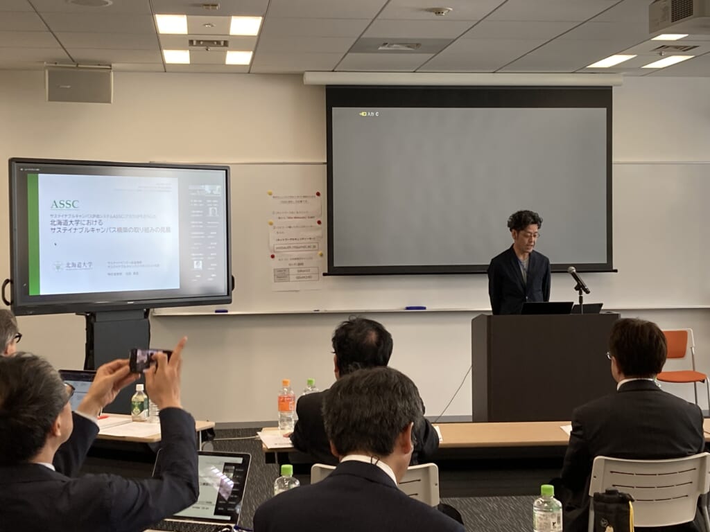認証校事例紹介では、プラチナ認証校としてサステイナブルキャンパスマネジメント本部の北岡真吾特任准教授が北海道大学の取り組み事例について発表しました。