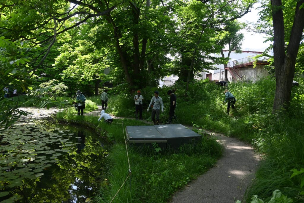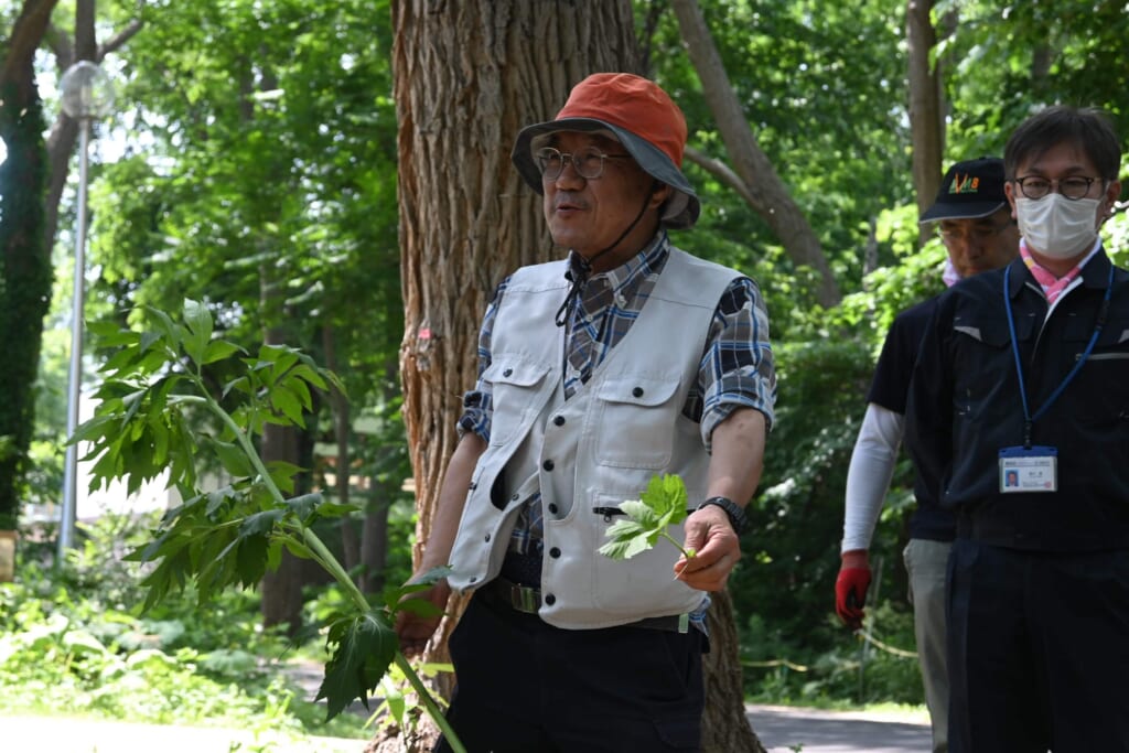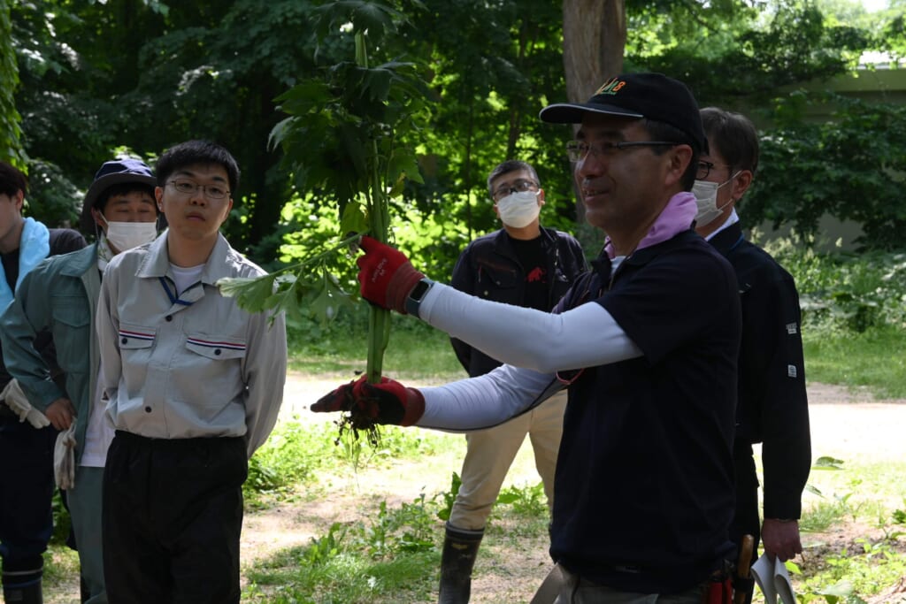 防除作業には、農学研究院 愛甲哲也 准教授、地球環境科学研究院 露崎史郎 教授、北海道大学総合博物館 大原昌宏 教授をはじめとして、施設部職員、サステイナビリティ推進機構教職員、学生が参加しました。