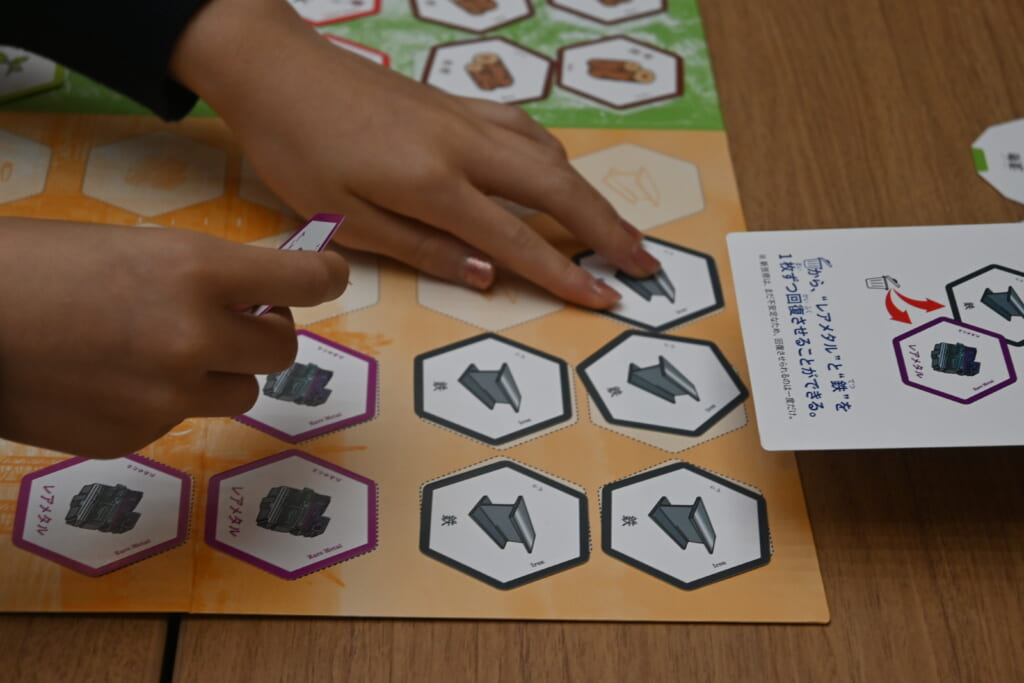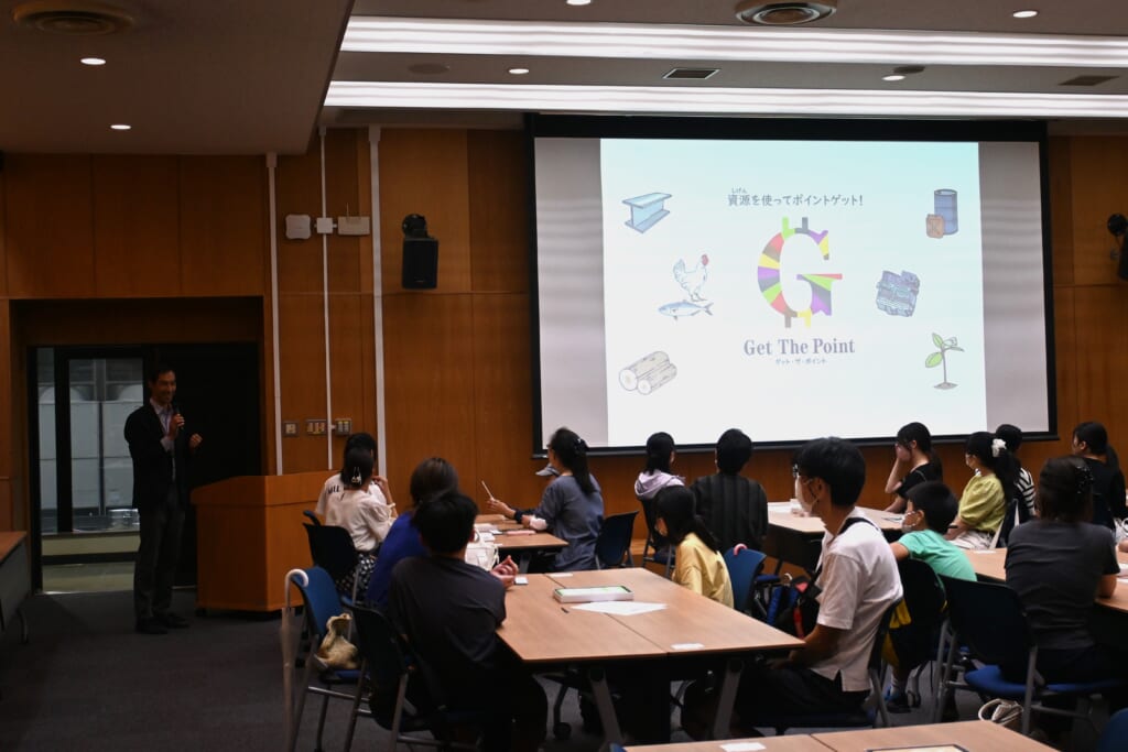 本講義に事前に申し込みを行った小中学生、高校生、大人(保護者)が参加して、「Get The Point」を行いました。本ゲームは、資源カードを使ってアイテムを作成しながら、持続可能性(サステイナビリティ)を体験するものです。本ゲームを通じて、持続可能な社会を実現していく上では、「みんなで共通の目標をもつこと」「みんなで話し合いをすること」の重要性を学びました。