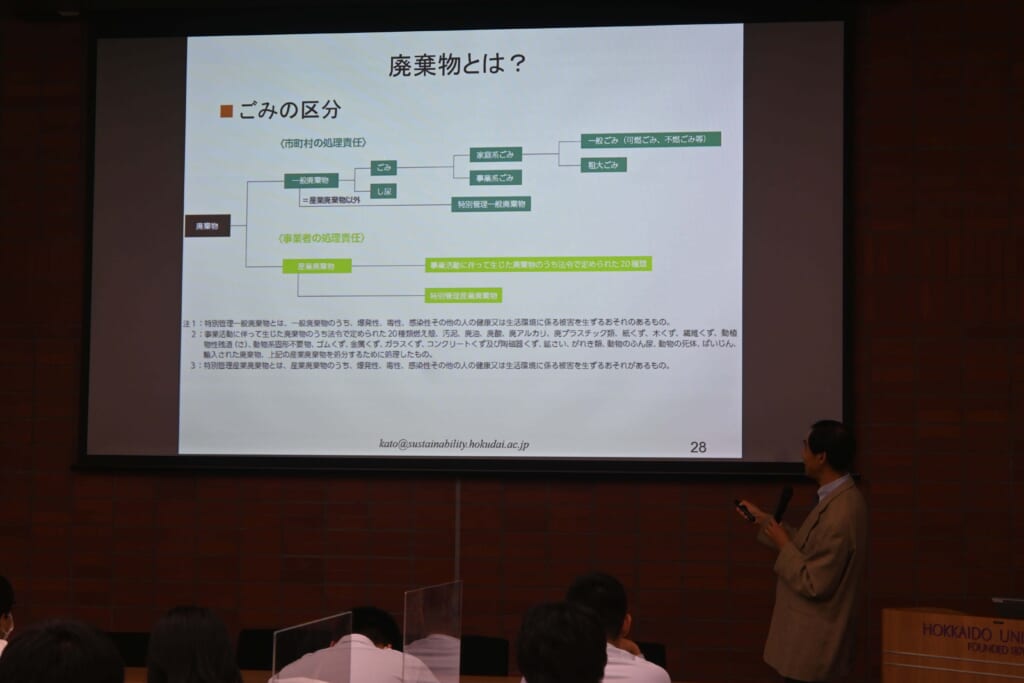 サステイナビリティ推進機構の加藤教授からごみ処理方法や、世界における日本のリサイクル率、ごみ焼却処理率、埋立処分率、世界のプラスチック消費量等について解説を行いました。