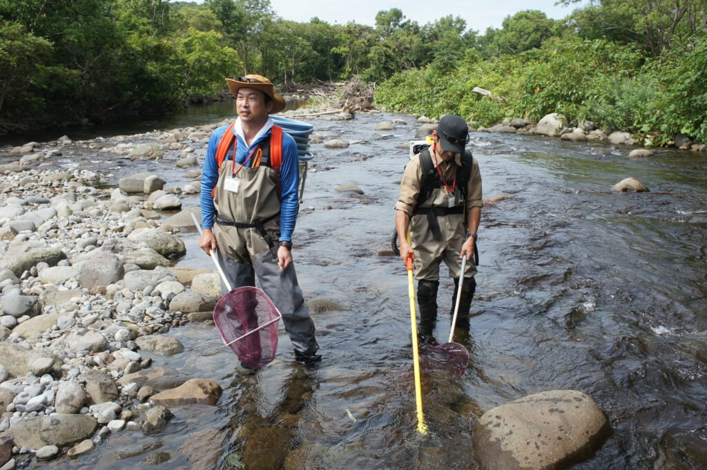 まず、北方生物圏フィールド科学センター和歌山研究林の岸田治准教授が、余別川に生息する魚の種類や生態についての説明を行いました。その後参加者は3つの班に分かれ、①川の魚を電気ショッカーで捕獲する様子の観察、②捕獲した魚の体長や重量、胃の内容物調査の実施、③川底にいる虫等の捕獲と観察をそれぞれ順番に行いました。この調査には、苫小牧研究林より、汲川正次森林技能職員、阿弓将人森林技能職員、内田次郎森林技能職員、松岡雄一森林技能職員、環境科学院修士2年の森山泉梨氏、環境科学院修士1年の南山以央理氏も加わり、魚捕獲の実演や、参加者の実習の補助等を行いました。