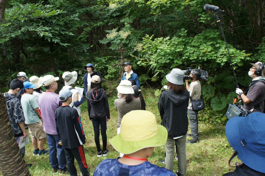 引き続き、天然林(二次林)エリアに移動し、北方生物圏フィールド科学センター苫小牧研究林の奥田篤志技術職員から、このエリアの植生の特徴や、山の栄養分が川を通じて海の豊かさに繋がっていることなどが紹介されました。