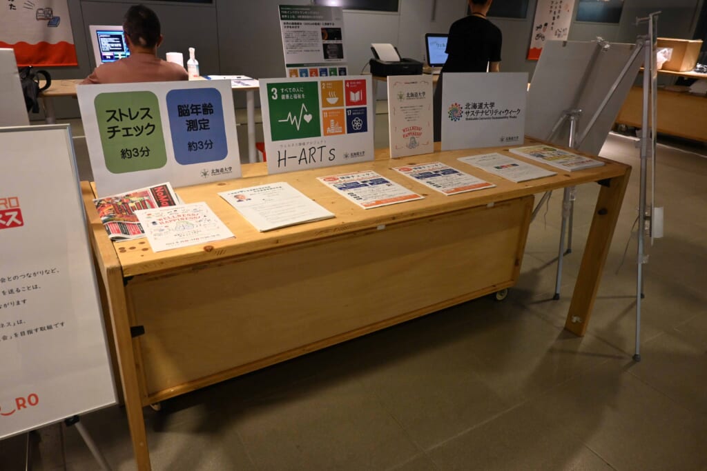 ブースでは、北海道大学のSDGsに関する取り組みのパネルによる紹介とともに、このプロジェクトで行う「無料で健康チェック!」として、「脳年齢測定」と「ストレスチェック」を無料で体験いただきました。