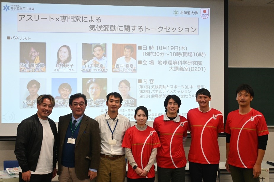 公益財団法人日本オリンピック委員会、一般社団法人冬季産業再生機構、サステイナビリティ推進機構SDGs事業推進本部及び地球環境科学研究院は、10月19日(木)、地球環境科学研究院大講義室で「アスリート×専門家による 気候変動に関するトークセッション」を開催しました。このトークセッションには、本学の学生、教職員及び高校生を含む一般市民39名が参加しました。