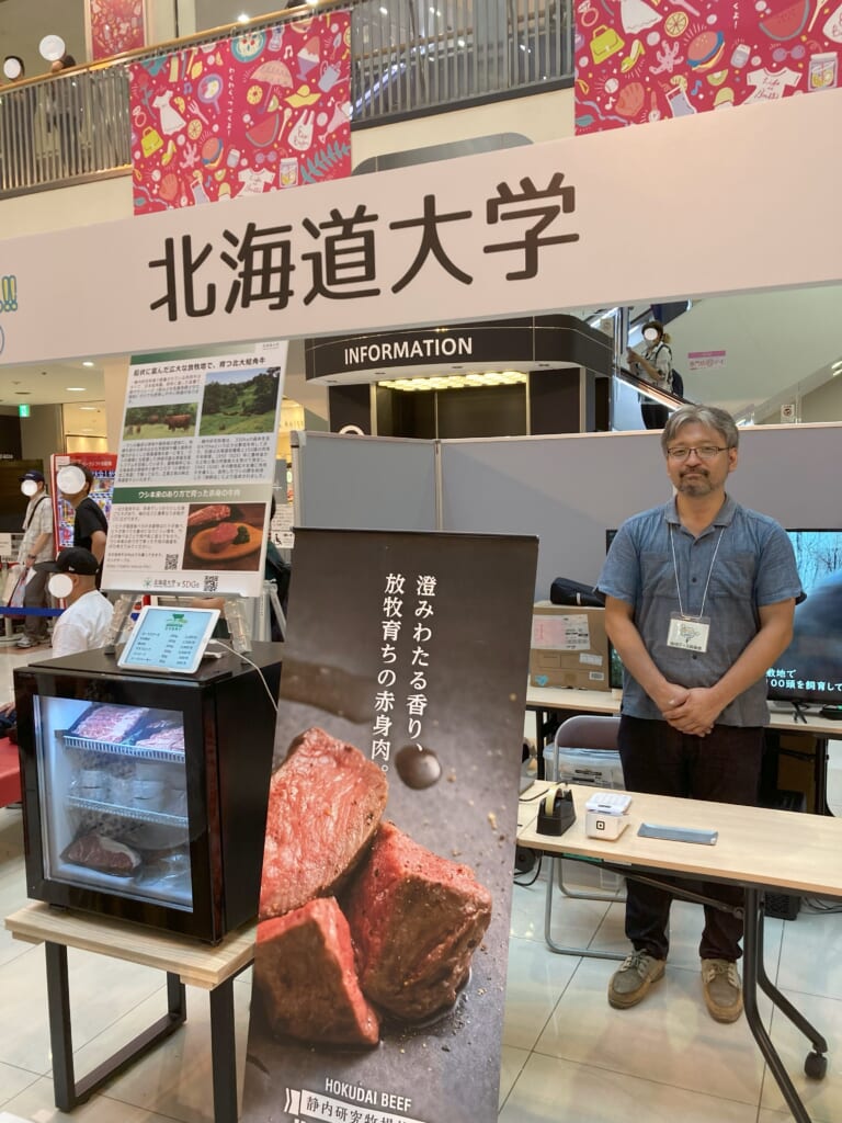 北大ブースでは、北大ブランドを通したSDGsに貢献する研究教育の紹介を目的として「北大短角牛」パネル展示とともに、北大短角牛の試食・販売を行いました。