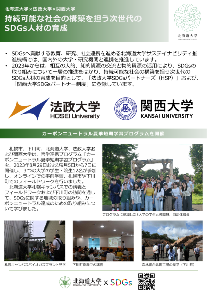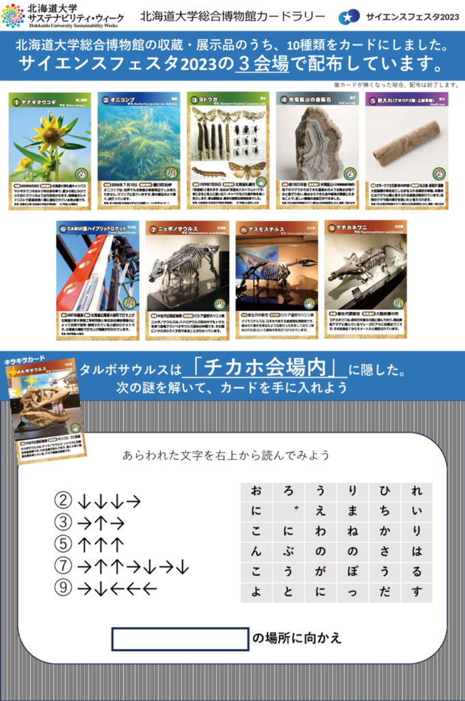 SDGs事業推進本部は、北海道大学サステナビリティ・ウィーク事業の一環として、本学におけるSDGsに貢献する研究教育についてのパネル展示や、今年度より開始した法政大学と関西大学との次世代のSDGs人材の育成に向けた連携活動について紹介しました。また、北海道大学総合博物館カードラリーを実施し、謎解き企画には400人を超える方にご参加いただきました。