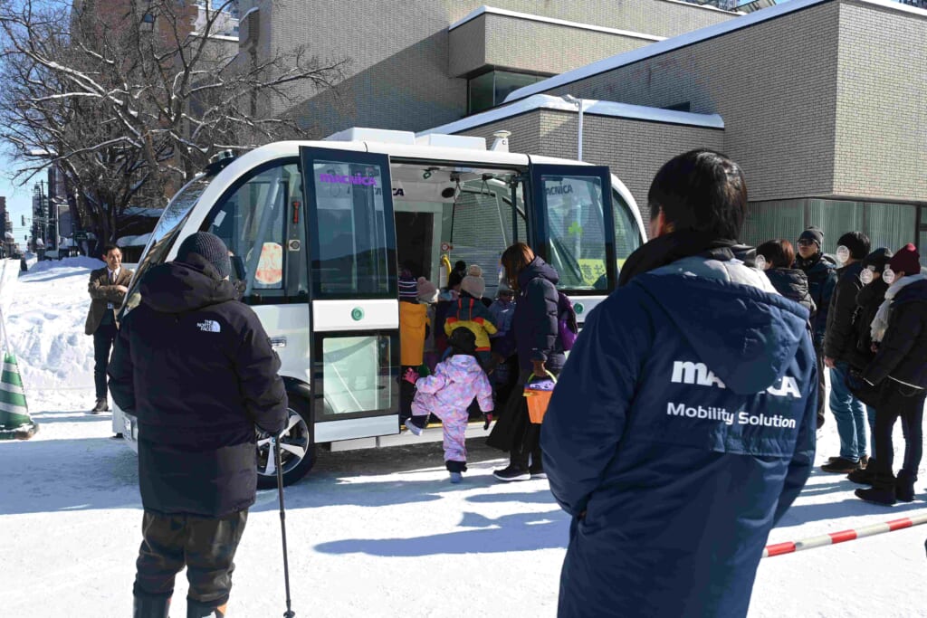 この問題を解決するため、「寒冷地」、「自動運転」、「エネルギー地産地消」の3つの視点から、自治体、交通事業者、エネルギー事業者、大学関係者などが集まり、北海道の地域公共交通の未来をより良くするための研究等を行っています。その取組の一貫として、学生を含む市民の皆様が興味を持ち、将来の交通を考えるきっかけとなるよう、構内交通の改善に期待できる自動運転車両の展示を行いました。