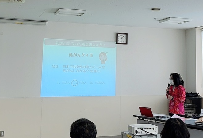 当日は1階の催事スペースで「脳年齢測定」、「血管年齢測定」、「骨健康度測定」及び「栄養士による健康相談」のほか、今回ご協力いただいた第一生命保険株式会社、株式会社第一生命経済研究所からは、乳がん触診モデルの体験と自己触診の解説、北海道コカ・コーラボトリング株式会社からは、免疫ケア商品の試飲提供をいただきました。2階のコミュニティスペースでは、株式会社第一生命経済研究所の田中三枝保健師を講師にお招きして「乳がん予防セミナー」を開催しました。