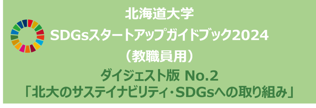 北海道大学サステイナビリティ推進機構SDGs事業推進部門は、「北海道大学SDGsスタートアップガイドブック2024(ダイジェスト版教職員用)」を作成し、本ウェブサイト上で公開します。