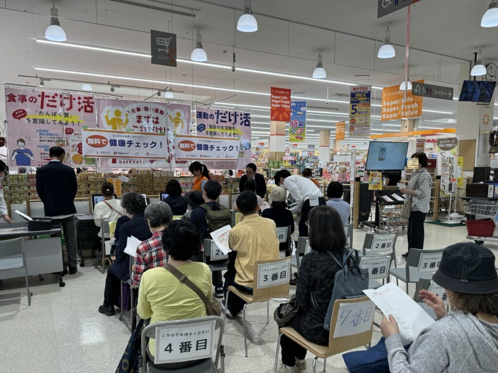 また、「無料で健康チェック!」は7人の大学生ボランティアに運営サポートをしていただき、「脳年齢測定」「骨健康度測定」「ベジチェック(推定野菜摂取量測定)」などに加えて、「高齢者についての総合相談窓口」を設けたほか、北海道味の素株式会社と連携し、運動・食事両面から普段の生活の中で簡単に健康を意識できる活動「だけ活」を紹介し、約240名が参加しました。
