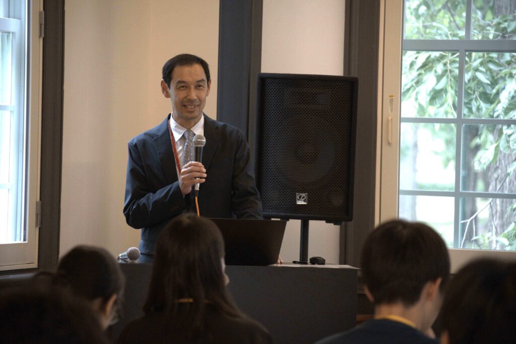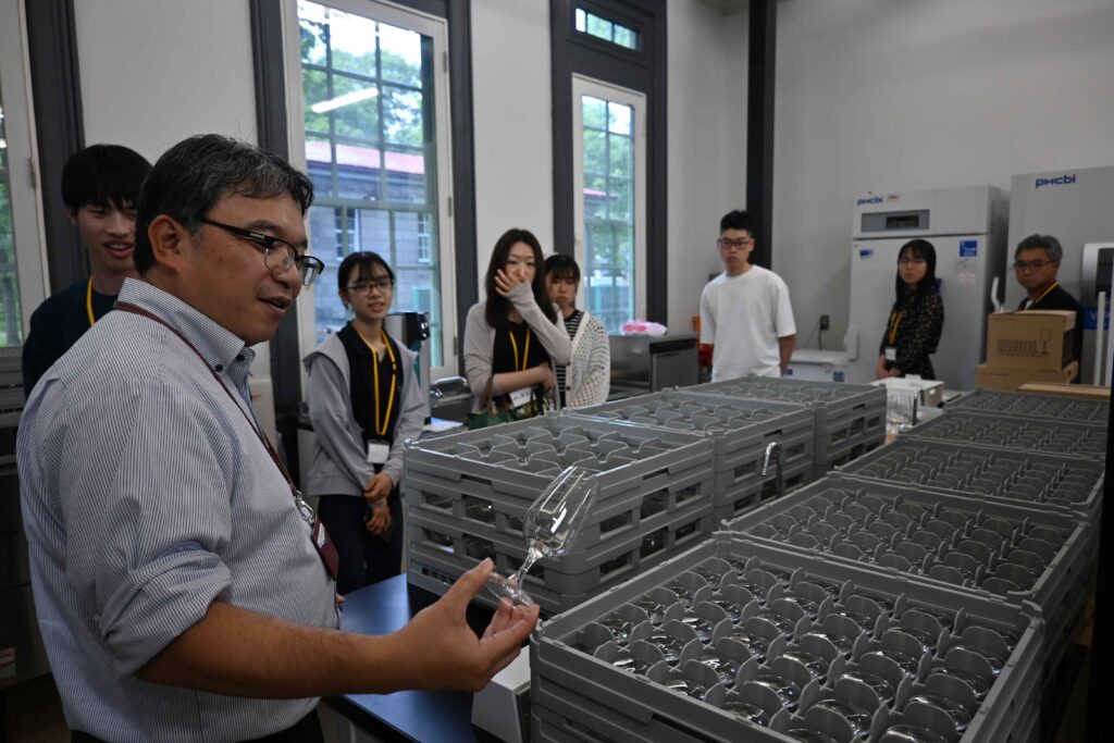 6月28日(金)には、受講生たちは北海道ワイン教育研究センター棟で、サステイナビリティ推進機構 加藤悟 教授のガイダンスと講義を受けた後、農学研究院 曾根輝雄 教授の講義を受け、センター内の見学を行いました。受講者たちは、ワイン研究に代表されるように、北海道大学が広大なフィールドを活かした研究・教育を行っていること、学内外のステークホルダーと協働し地域の課題解決に貢献していること、そしてこうした活動が社会貢献を指標にしたTHEインパクトランキングで高い評価を得ていることなどの説明を受けました。