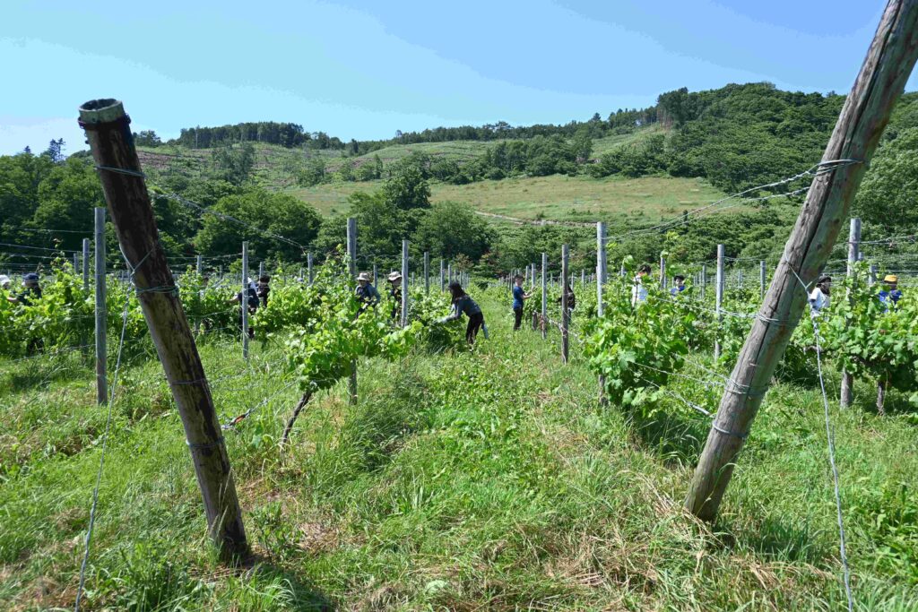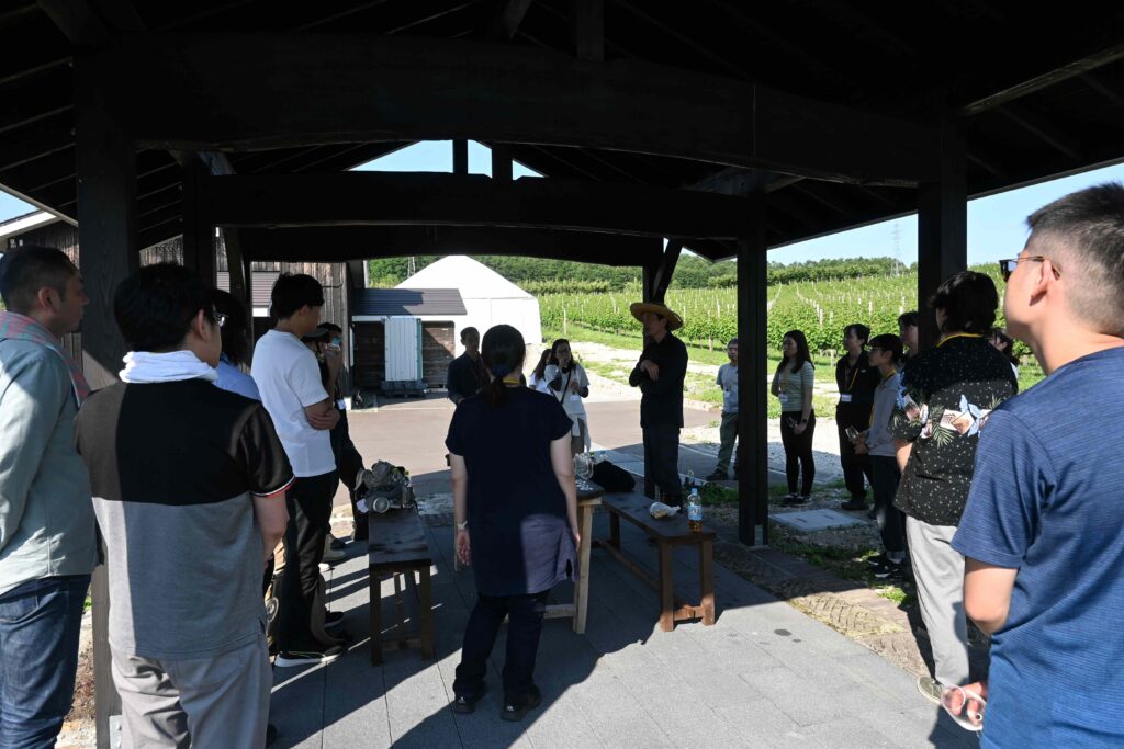 6月29日(土)には、受講生たちは午前中に、北海道大学余市果樹園を訪問し、ワイン用のブドウ、ハスカップ、りんご等が栽培されている様子を見学し、ワインの品質分析機の実演等を見学しました。午後には、受講生たちは平川ワイナリーを訪問し、平川敦雄氏からワイン用ブドウ栽培や醸造についての講義を聞いた後、農園でブドウ棚の整備やブドウの誘引作業、平川ワイナリーで醸造したワインの試飲をおこないました。受講生たちは一連の見学や体験を経て、ワインには単なるお酒としての魅力だけではなく、北海道が誇る各地の食や、地域の観光資源をつなぎ、地域に人を惹きつける力を持っており、ワインが北海道の地域の持続性を高める鍵となっていることを学びました。