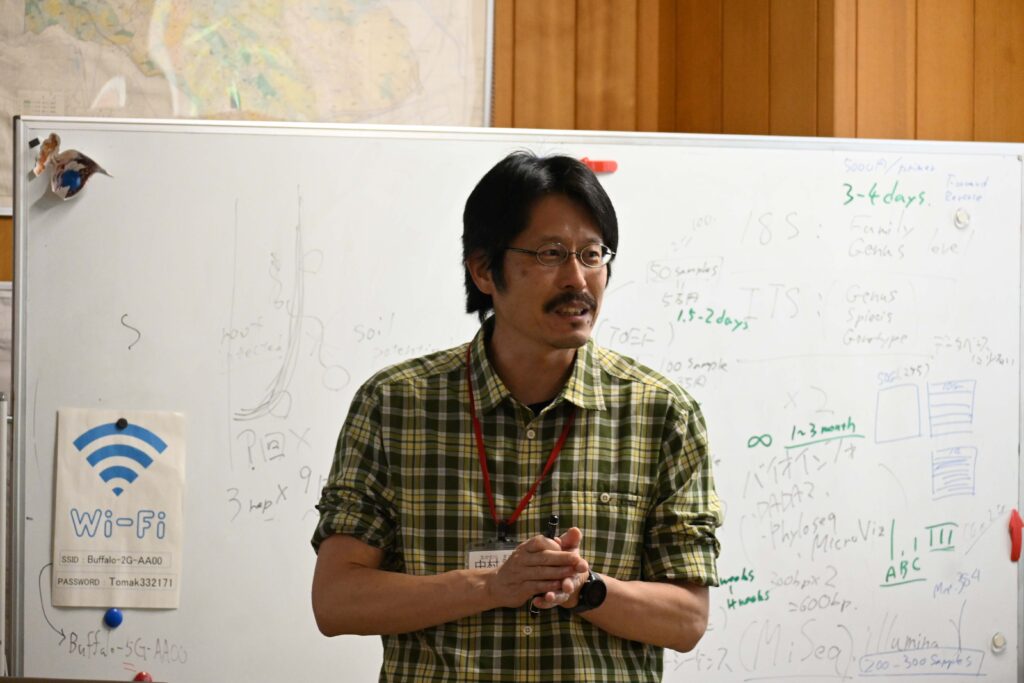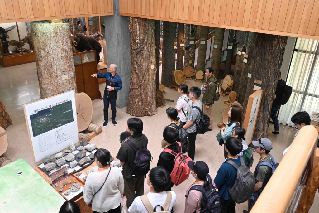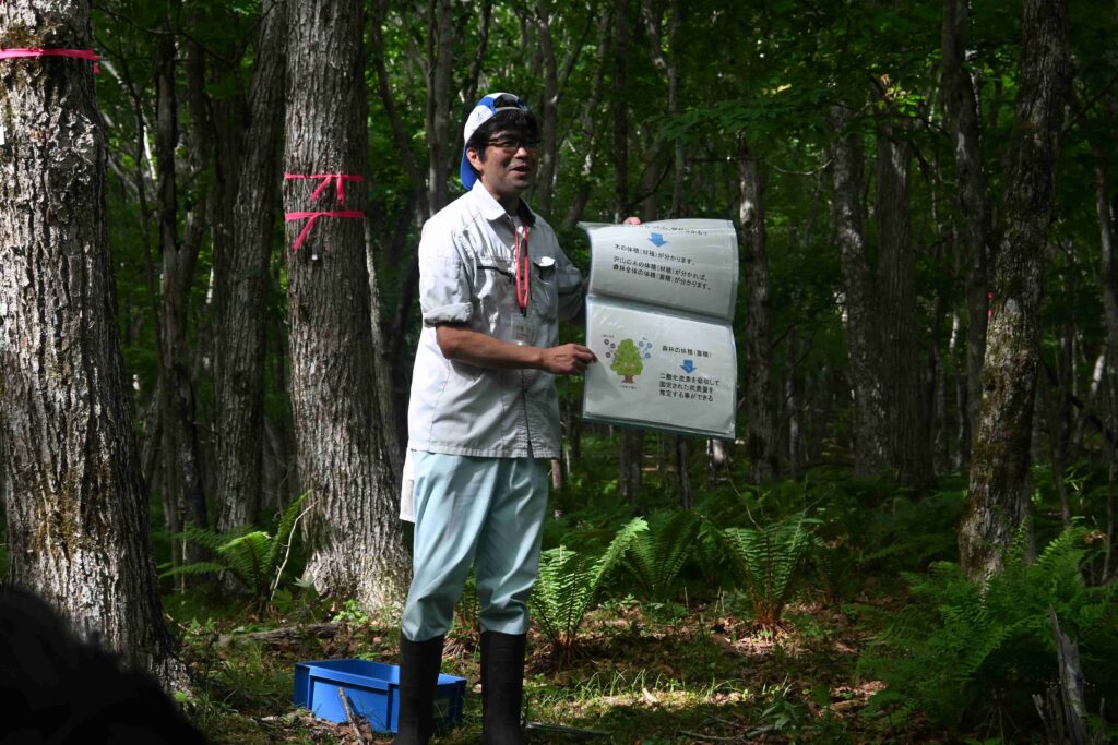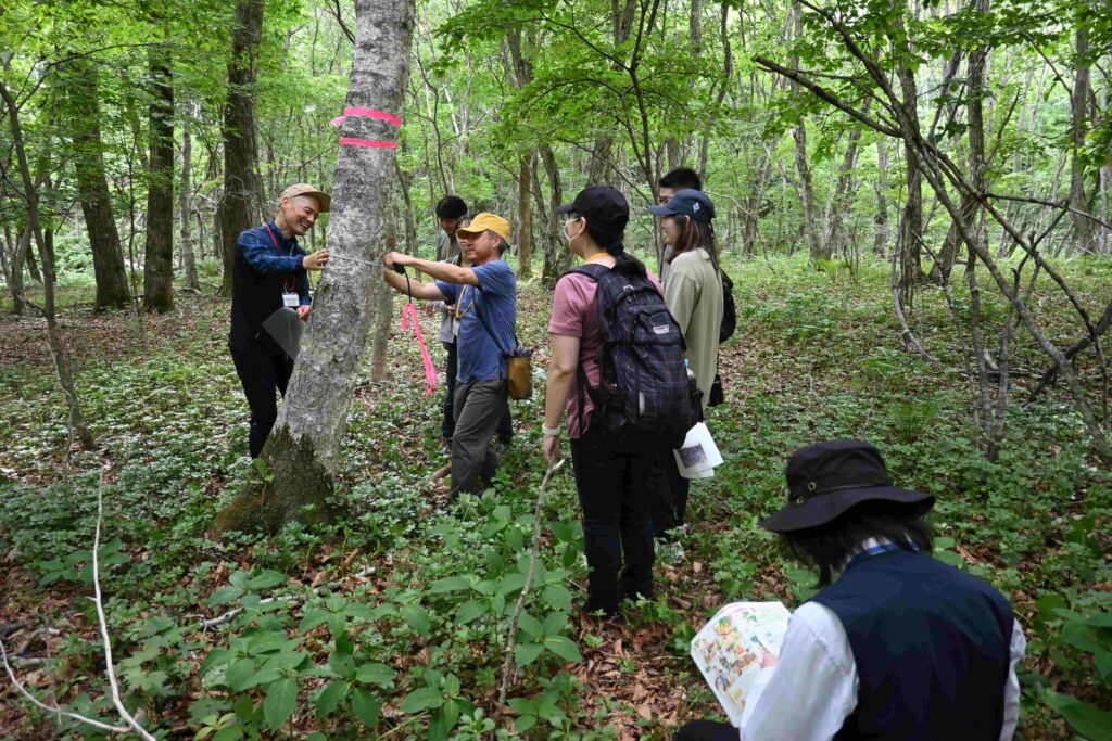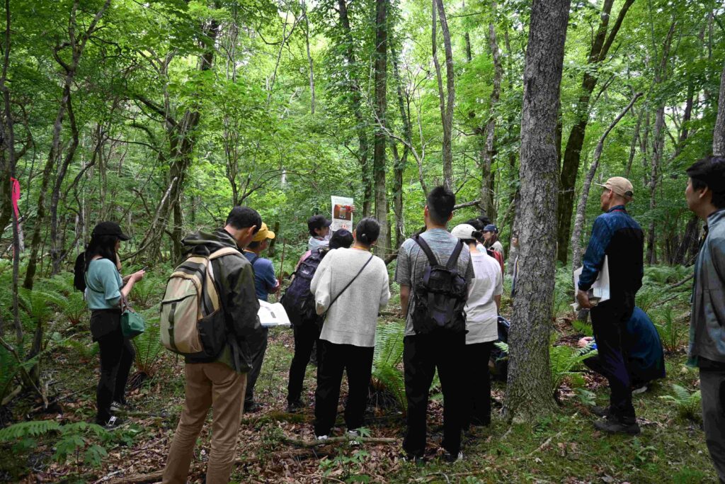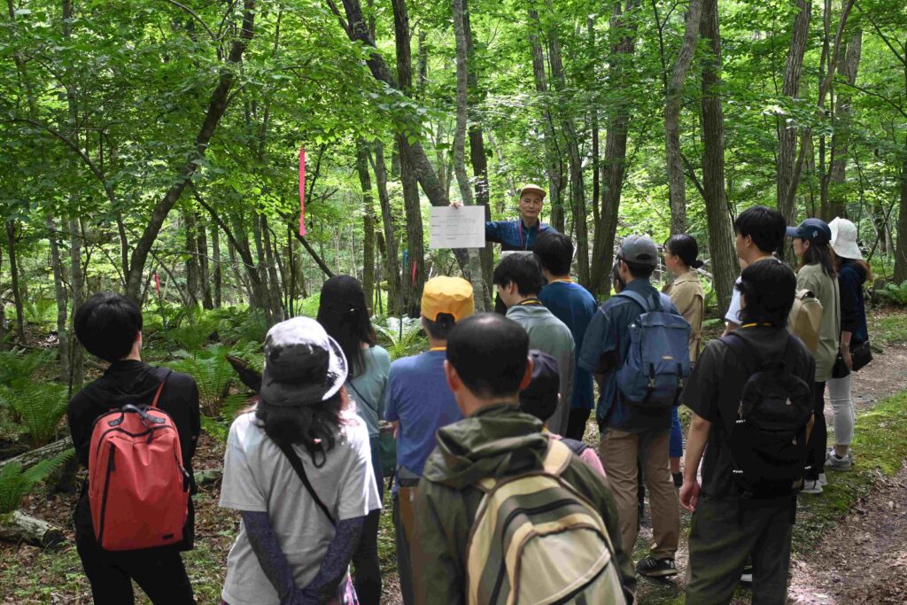 6月30日(日)には、受講生たちは北海道大学苫小牧研究林を訪問し、苫小牧研究林長 中村誠宏 教授による講義を受けた後、森林資料館・森林記念館の見学を行いました。午後には、受講生たちは、苫小牧研究林の林内にバスで移動し、苫小牧の地質の特徴や研究林内で実施している調査・研究の紹介を受けました。その後、受講生たちは3つのグループに分かれ、毎木調査をベースにした樹木の胸高直径の測定と樹種の判定のワークショップに参加しました。受講生たちは、一連の受講内容を受けて、自然の力を利用して生態系と人間いずれにも利益をもたらす方法で社会的課題を解決するという「ネイチャー・ベースド・ソリューション(Nature-based Solutions:NbS)」という考え方を理解し、「モニタリングサイト1000」での生態系調査の理念である「長期間」「広い範囲」で調査することの重要性について学びました。