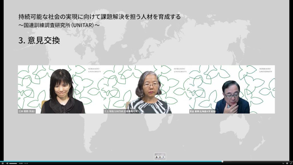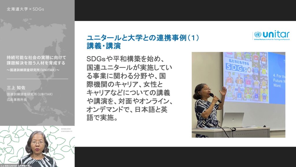 表敬訪問は、寳金清博総長、横田篤理事・副学長らが応対し、三上所長からユニタールの活動紹介を受けた後、主に発展途上国での両機関の貢献について意見交換が行われました。また、全教職員を対象に、三上所長による講演会「持続可能な社会の実現に向けて課題解決を担う人材を育成する~国連訓練調査研究所(UNITAR)~」をオンラインで実施しました。本講演会はオープンエデュケーションセンター(OEC)協力のもと実施した本講演会は、江本理恵高等教育推進機構教授が司会を務めました。講演後の質疑応答では、本学においても平和についての教育が重要であるとのコメントが参加者からあったほか、両機関における連携可能性などについて活発な意見交換が行われました。