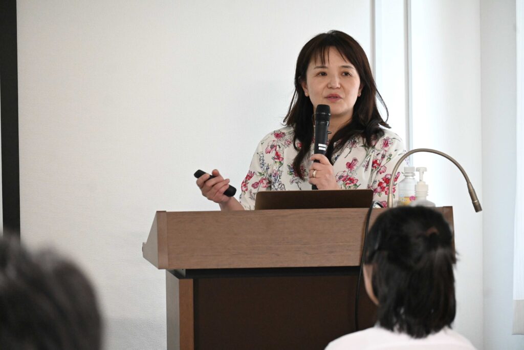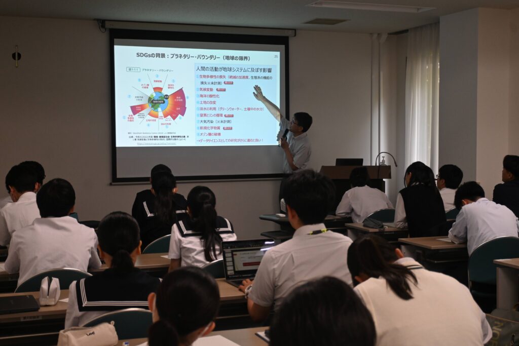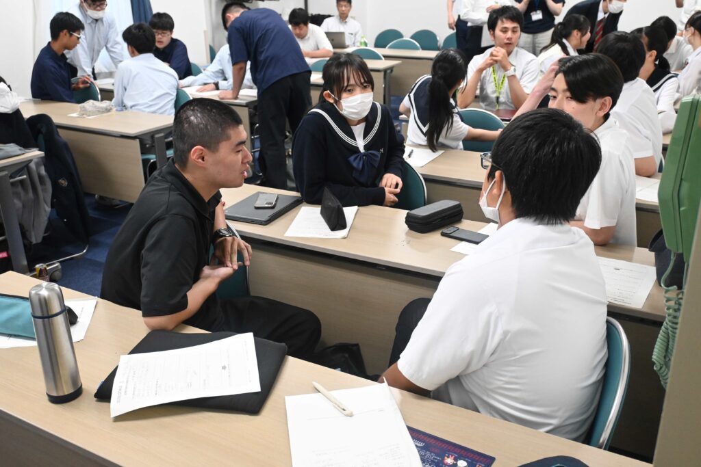 昼休みを挟んだ後、「折り紙の先端技術への応用」と題して、繁富香織 大学院教育推進機構准教授が講義を行い、自身が研究者となった心構えと、折り紙技術の多分野での応用について解説しました。続いて、「大学で学ぶSDGs」と題して、出村誠総長特命参与が講義を行い、自分たちの地域を知り、地域で自分たちの取り組みを探すことの重要性について解説しました。講義後は、生徒たちがこれまで取り組んできた探究活動についてワールドカフェ方式で討論を行いました。他校生徒などとの交流を通じて、さまざまな視点からの見方や考え方を知り、それぞれが取り組む課題への理解を深めていきました。