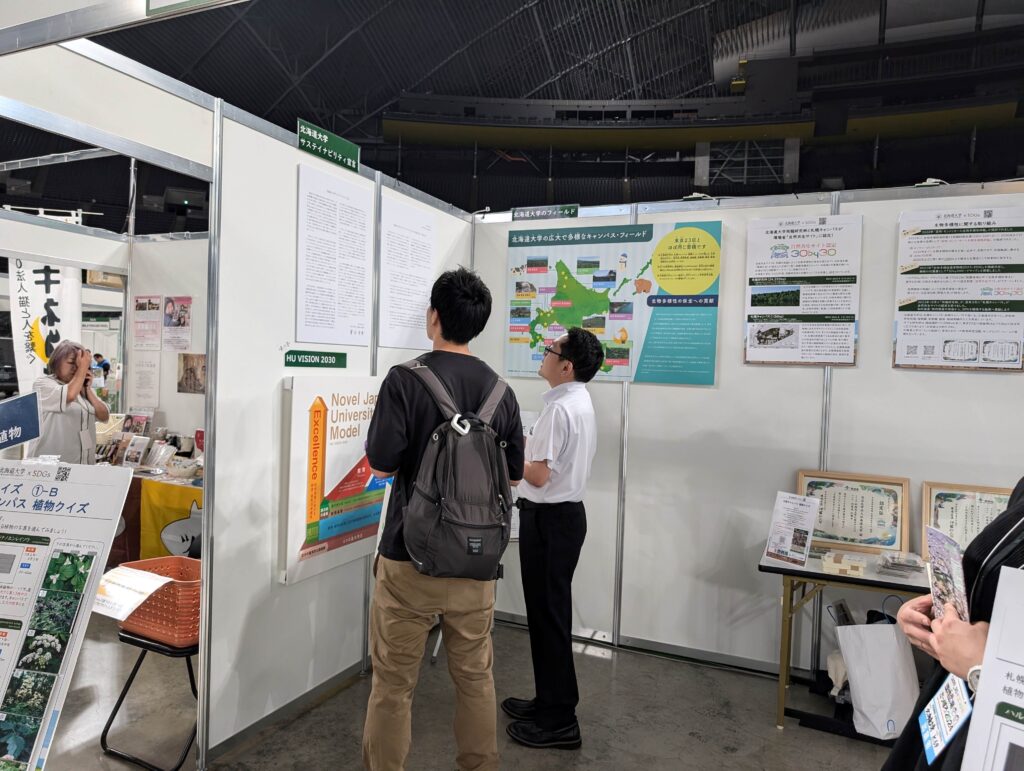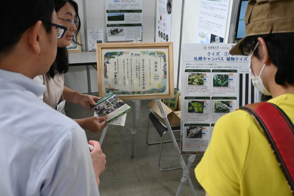本学のブースでは、「HU VISION 2030」のレリーフ、「北海道大学サステイナビリティ宣言」及び本学の広大なフィールド、研究、オリジナルブランド等を紹介するパネルの展示を行いました。また4月に本機構キャンパスマネジメント部門が発行した「北海道大学札幌キャンパス生き物ガイド」をもとに作成した、「札幌キャンパス植物クイズ」を行いました。ブース来訪者に、札幌キャンパスが環境省から自然共生サイトの認定を受けていること、持続的な緑地の保全・管理を実施していること等を紹介しました。