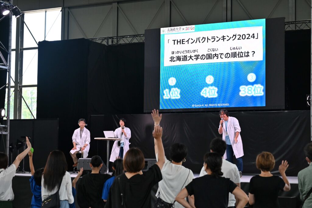 ステージ発表では、「あつまれ!未来のSDGs博士!」と題して、本学発認定スタートアップ企業「合同会社エゾリンク」の風張喜子氏、クォン テオ氏による司会進行のもと、観客参加型のクイズを行いました。クイズを通して、本学がTHEインパクトランキングで高い評価を得ていること、広大なフィールドを有しており、フィールドを活かした研究を行っていること等を紹介したほか、出村 誠総長特命参与から、本年8月1日付けで策定した「北海道大学サステイナビリティ宣言」の紹介を行いました。