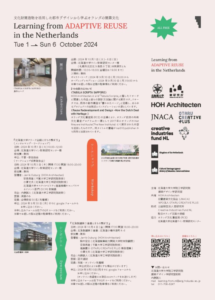 工学研究院建築デザイン学研究室は、「文化財建築物を活用した都市デザインから学ぶオランダの建築文化『Learning from ADAPTIVE REUSE in the Netherlands』」を10月1日から6日に開催します。期間中は以下の「展示」「ワークショップ」「シンポジウム」を行います。