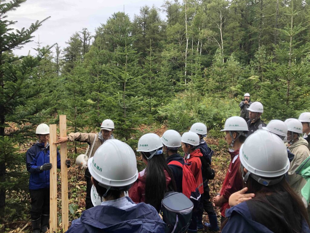 その後、天候が回復してきたことから、役場から約5キロ離れた美国地区のJTの森 積丹に移動し、吉田教授のほか、サポートスタッフとして同行したFSCの奥山智浩技術専門職員と伊藤悠也技術専門職員及び環境科学院の博士課程の学生とともに約1キロを散策しながら、森の木々や植生を観察したほか、成長錐というT字型の道具を使い年輪のサンプルを抽出して樹齢の計測体験や、唐松の木の伐採作業を見学しました。
