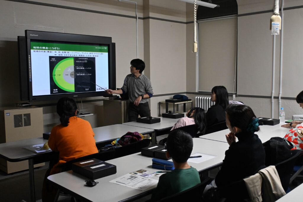 午後には総合博物館で、恐竜、遺跡、岩石・鉱物、植物をテーマとした4つのワークショップが行われ、約120人が参加しました。参加者は普段手にすることができない本物の化石や貴重なレプリカに触れたり、札幌キャンパス内の樹木を観察したりしながら、担当教員から専門的な講義を聞きました。