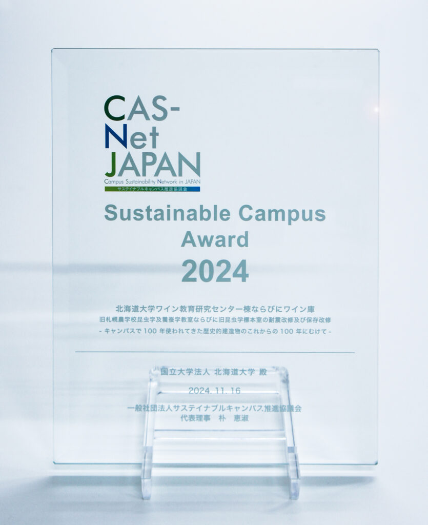北海道ワイン教育研究センター棟改修及び自然共生サイト(*1)認定・OECM(*2)登録に関する取組が、一般社団法人サステイナブルキャンパス推進協議会(CAS-Net JAPAN)が主催する「サステイナブルキャンパス賞2024」を受賞し、11月16日(土)に京都大学国際科学イノベーション棟で開催された同協議会2024年次大会にて表彰式が行われ、表彰状と楯が授与されました。