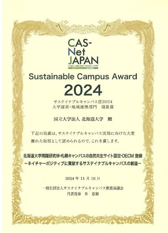 「自然共生サイト認定・OECM登録」は、30by30(*3)目標・ネイチャーポジティブへの貢献を見据えた全学的な取組として、2022年の「生物多様性のための30by30アライアンス」への参加を皮切りに、保有するキャンパス(附属施設含む)の自然共生サイト認定・OECM登録に向けた取組で、これまで雨龍研究林・札幌キャンパスの2箇所が自然共生サイトの認定を受け、OECMに登録されています。審査員からは、国立大学としては初めての「生物多様性のための30by30アライアンス」への参加や、自然共生サイト認定、OECM国際データベースへの登録など、先導的で模範的な取組は高く評価できるとの講評がありました。
