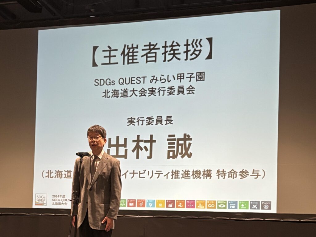 「SDGs QUEST みらい甲子園 北海道大会実行委員会」が主催する「SDGs QUEST みらい甲子園 北海道大会」の2024年度大会ファイナルセレモニーが、3月20日にさっぽろ創成スクエア3F クリエイティブスタジオ(札幌市中央区北1条西1丁目6)で開催されました。本セレモニーでは、実行委員会の委員長を務める北海道大学 出村誠 総長特命参与が、開会挨拶・「SDGs QUEST アクションアイデア最優秀賞」の表彰、全体講評を行いました。