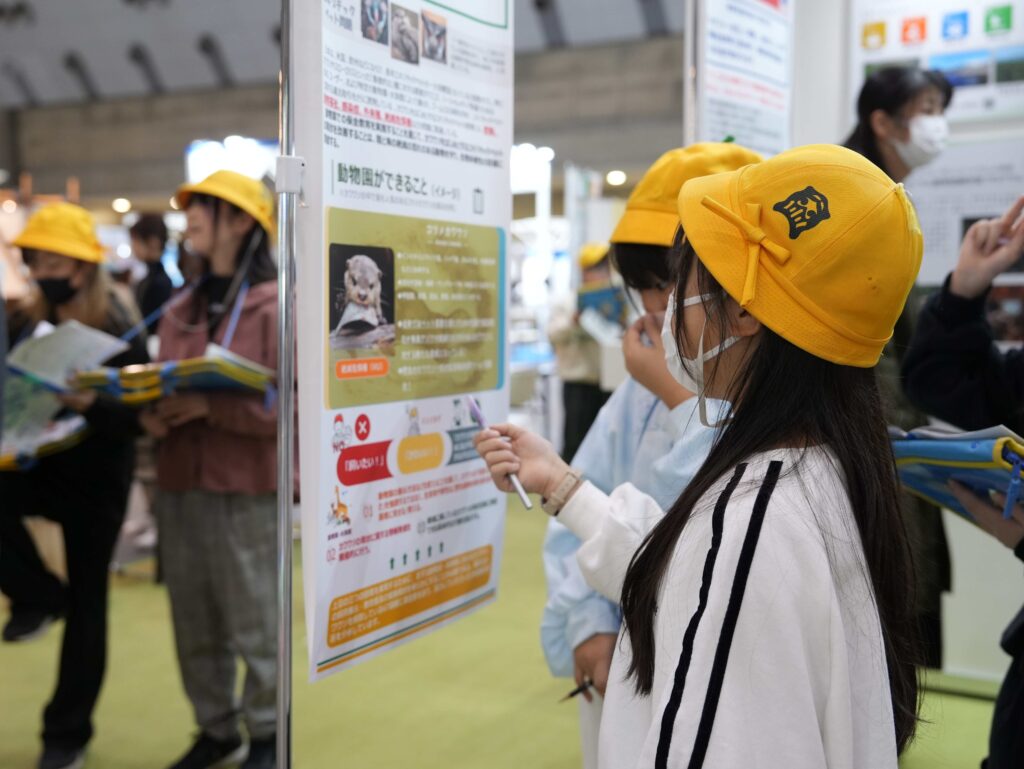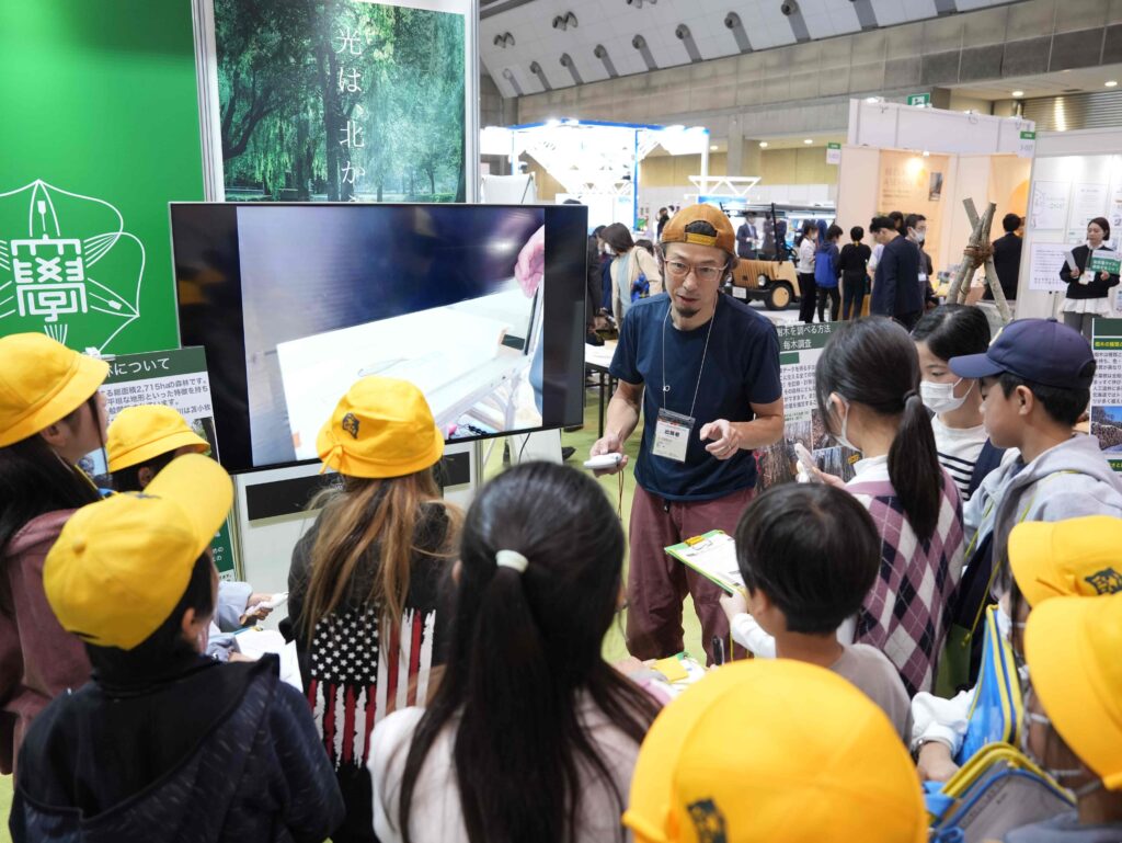 開催期間中には、開場と同時に多くの小中学生がブースを訪れ、あらかじめ調べてきた北海道大学のSDGsに関する取組について質問をしたり、博士後期課程の学生や職員の説明を熱心に聞いたりしていました。また、北海道大学卒業生のほか、ブースを出展した他大学や企業等からの訪問も多く、北海道大学の唯一無二の特徴や取組を知ってもらうきっかけ用意した説明ボードで北海道大学の取組を紹介苫小牧研究林の魚類調査の説明となりました。