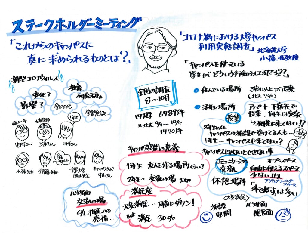 これまで大学キャンパスは、教育・研究活動を支える学内構成員の生活の場でしたが、コロナ禍を受け、その存在意義や在り方が改めて問われているように考えます。今回のステークホルダーミーティングでは、本学の教職員・学生、学外有識者も交えて、これからの大学キャンパスに真に求められるものを考えました。率直な意見が交わされ、大変有意義なものとなりました。詳細は2021年9月末公開の「北海道大学サステイナビリティレポート2021」に掲載の予定です。