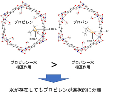 野呂真一郎教授らの研究グループは、水分子が共存しても炭化水素ガスを分離できることを明らかにしました。プロピレンなど分子内に二重結合をもつ炭化水素ガスは、プラスチックや化学繊維などの原材料として重要で、これを精製するためには別の炭化水素ガスから分離する必要があり、現状はコストがかかる蒸留法により精製されています。野呂教授らは、プロピレンを選択的に分離できる多孔性材料に水を含ませた状態で実験を行い、水が存在していてもプロピレン分離性能がほぼ維持されることを世界で初めて実証しました。この分離法は蒸留法に代わる新しい分離法として評価されるだけでなく、この成果をもとにコストがかかる水の分離プロセスを省くことができれば、実用化がより加速されると期待されています。