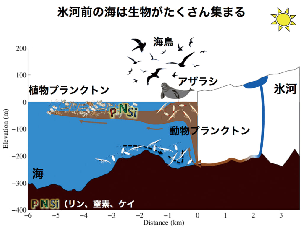 本学の北極域研究センター、低温科学研究所、大学院水産科学研究院の共同研究グループは、グリーンランドの氷河の融け水による湧昇流(プルーム)が、フィヨルドの中層(深さ200m)から栄養塩を汲み上げるポンプとして機能していることを発見。表層へ運ばれた栄養塩は亜表層(深さ10~50m)に水平的に広がり、プルームの真上では栄養塩を利用して植物プランクトンが大増殖を起こす様子も明らかにしました。これまでの研究によって、融け水がフィヨルドの基礎生産(光合成等による有機物生産)に果たす役割が証明され、今後は融解水が生み出す生態系を総合的に理解することが重要とされます。