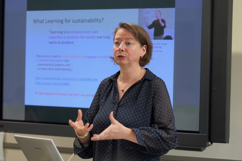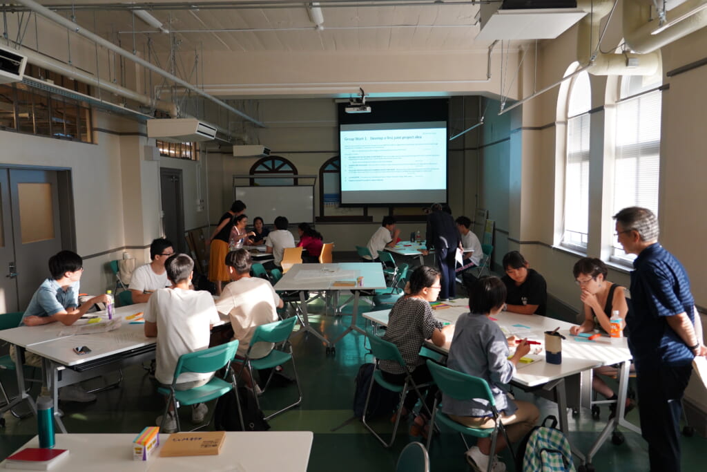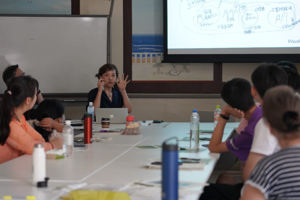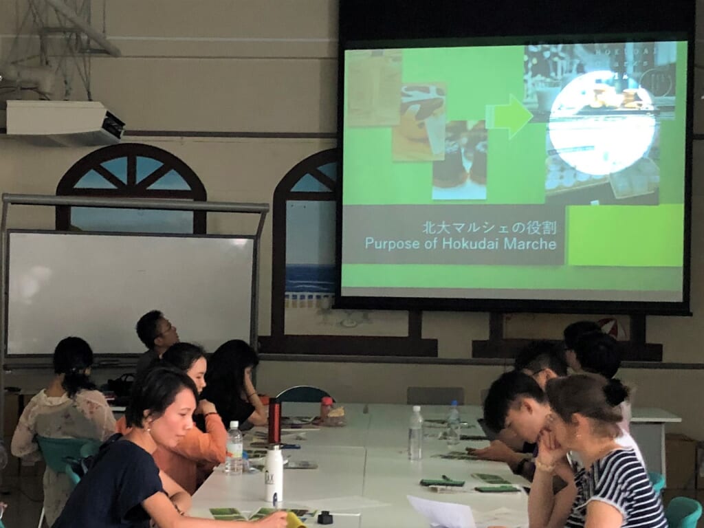 持続可能性の問題に関わる概念、これらの具体例などについて講義を行い、緑地の維持や農場の役割という、本学特有のキャンパス機能にテーマを広げ、持続可能性の問題を形成する社会的要素の相互依存性を学びました。札幌キャンパスを例に、学生同士で話し、手を動かし、考えを発表することで、社会的課題の解決策の導き方を試行的に体験しました。