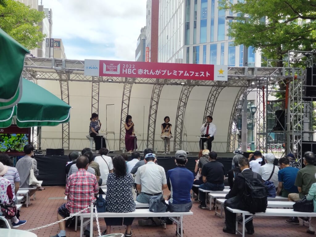 また、ステージには、7月10日(日)12:00~13:00開催の「【北海道ワイントーク】今、北海道ワインが熱い!北海道が元気になるワインを学ぶ!」に「北海道ワインヌーヴェルヴァーグ研究室」の曾根輝雄教授(農学研究院)が、HBCアナウンサーとともに出演しました。