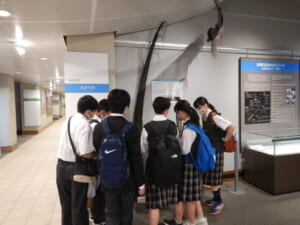 見学後、加藤教授と生徒たちは見学の振り返りを行いました。生徒たちからは「恐竜の化石や動物のはく製がたくさんあった」「いろんな鉱物がたくさんあった」「アイヌについての展示があった」「木の品種改良の取り組みを知れた」といった気づきが出されました。加藤教授は「調べること、知ることで次につながる。恐竜の絶滅は人間社会にも当てはまるかもしれないし、鉱物を通して地球の歴史を知ることも大事だ。アイヌの歴史を知ったり過去の反省はこれからの共生につながる。」と応えていました。