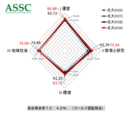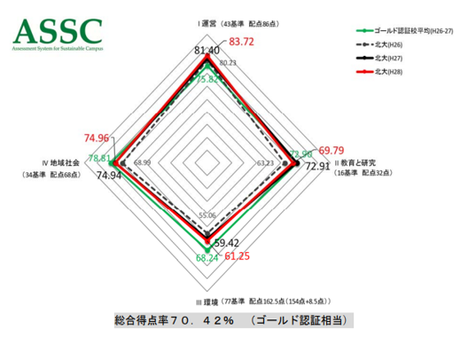 下記のレーダーチャートからもわかるように、得点率は少しずつ上昇しており、サステイナブルキャンパスの取り組みが前進しています。2016年度から2020年度はゴールド認証を獲得し、2021年度は初のプラチナ認証を取得しました。