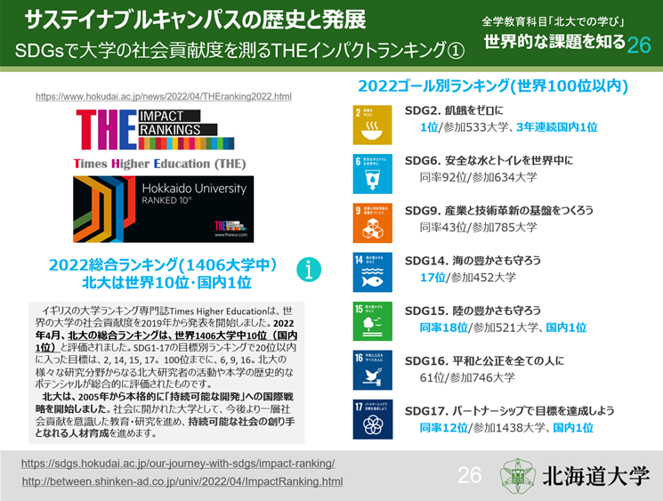 本学では、2023年4月より、学部初年次全学生(2500名規模)を対象に開講する「導入科目(北大での学び)(必修)」においてSDGsを理解するための講義「世界的な課題を知る」をオンデマンドで実施しています。2024年4月より大学院共通授業科目「北大大学院での学び(必修)」において同様にSDGsを理解する講義を開講しています。