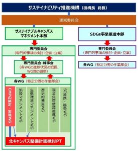 本学における先端研究を加速させるイノベーション・コモンズ(パブリックスペース等)整備基本計画の策定に当たり、下図のとおり、運営組織の一つであるサステイナビリティ推進機構サステイナブルキャンパスマネジメント本部専門委員会のワーキンググループと位置づけているキャンパスマスタープランの策定・実現ワーキンググループ内に北キャンパス整備計画検討プロジェクトチームを設置しました。